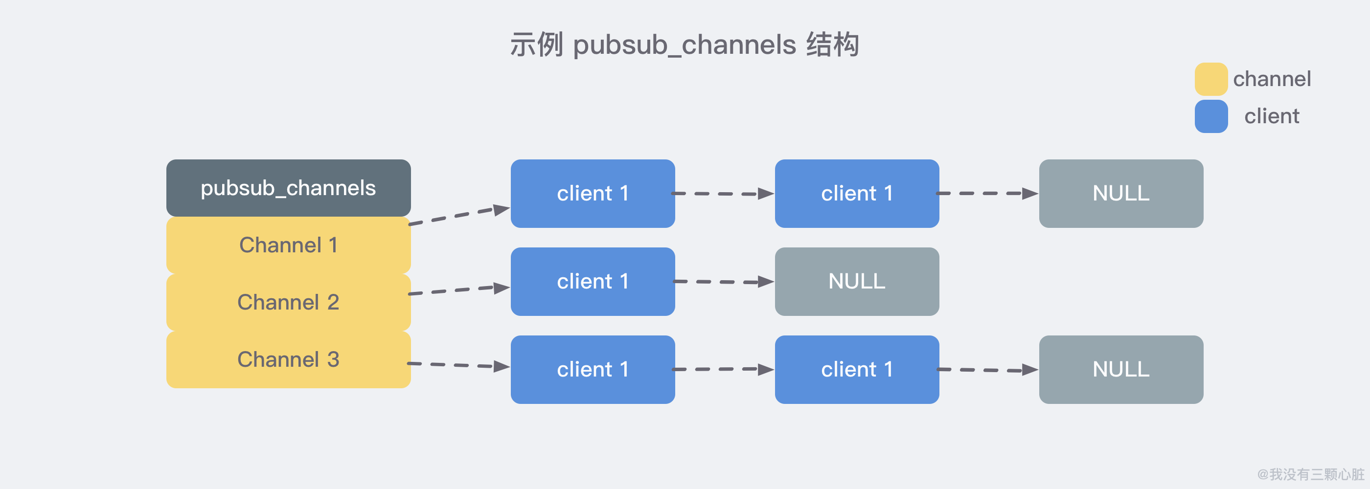 当客户端订阅某一个频道之后,Redis 就会往 pubsub_channels 这个字典中新添加一条数据,实际上这个 dict 字典维护的是一张链表,比如,下图展示的 pubsub_channels 示例中,client 1、client 2 就订阅了 channel 1,而其他频道也分别被其他客户端订阅:
