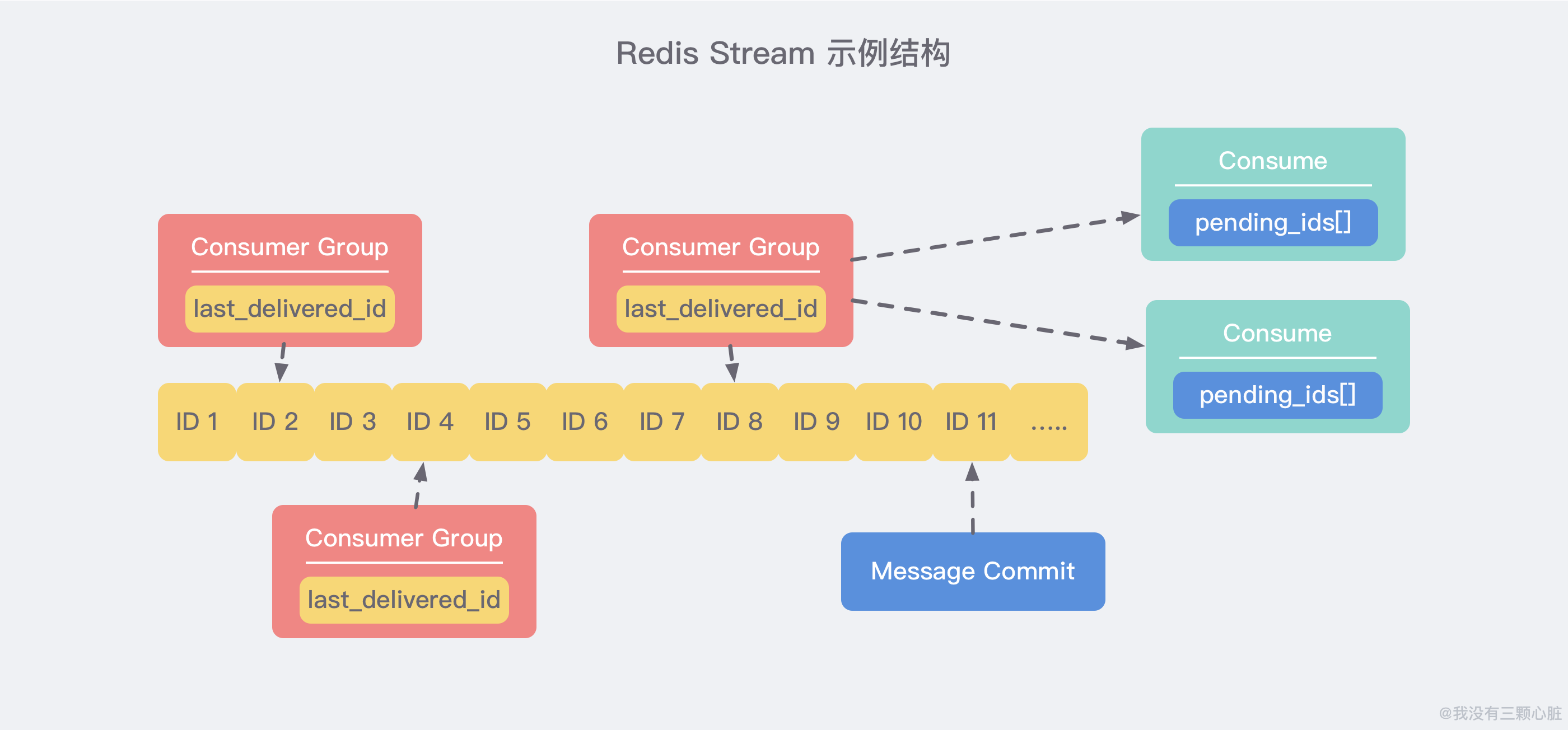 XREAD命令进行 独立消费,也可以多个消费者同时加入一个消费者组进行 组内消费。同一个消费者组内的消费者共享所有的 Stream 信息,同一条消息只会有一个消费者消费到,这样就可以应用在分布式的应用场景中来保证消息的唯一性。 - last_delivered_id:用来表示消费者组消费在 Stream 上 消费位置 的游标信息。每个消费者组都有一个 Stream 内 唯一的名称,消费者组不会自动创建,需要使用