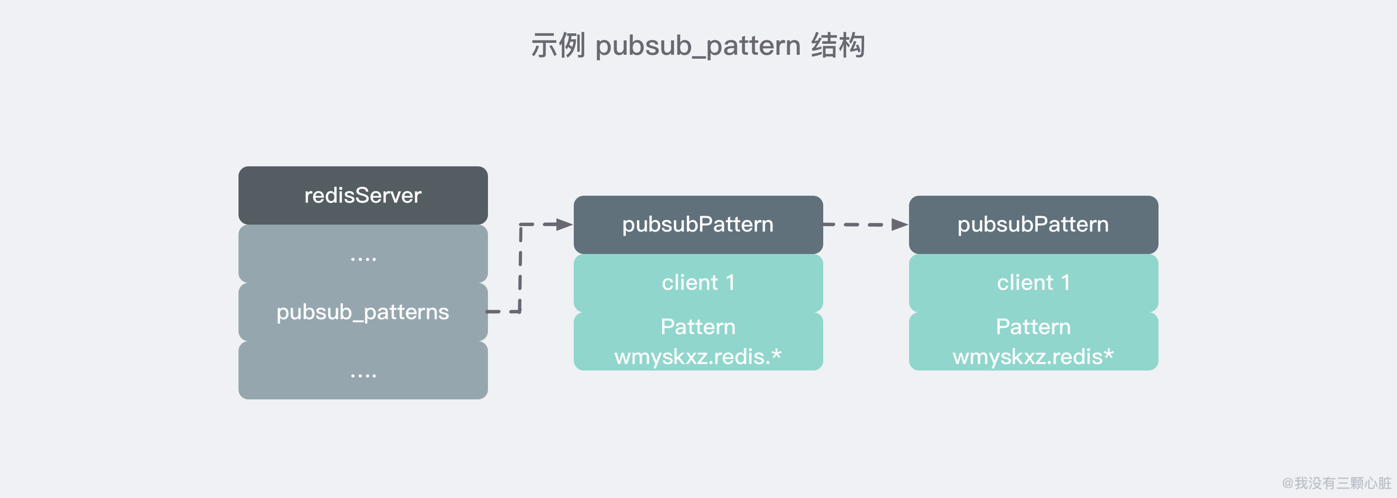 正如我们上面说到了,当发送一条消息到 wmyskxz.chat 这个频道时,Redis 不仅仅会发送到当前的频道,还会发送到匹配于当前模式的所有频道,实际上,pubsub_patterns 背后还维护了一个 redis.h/pubsubPattern 结构: