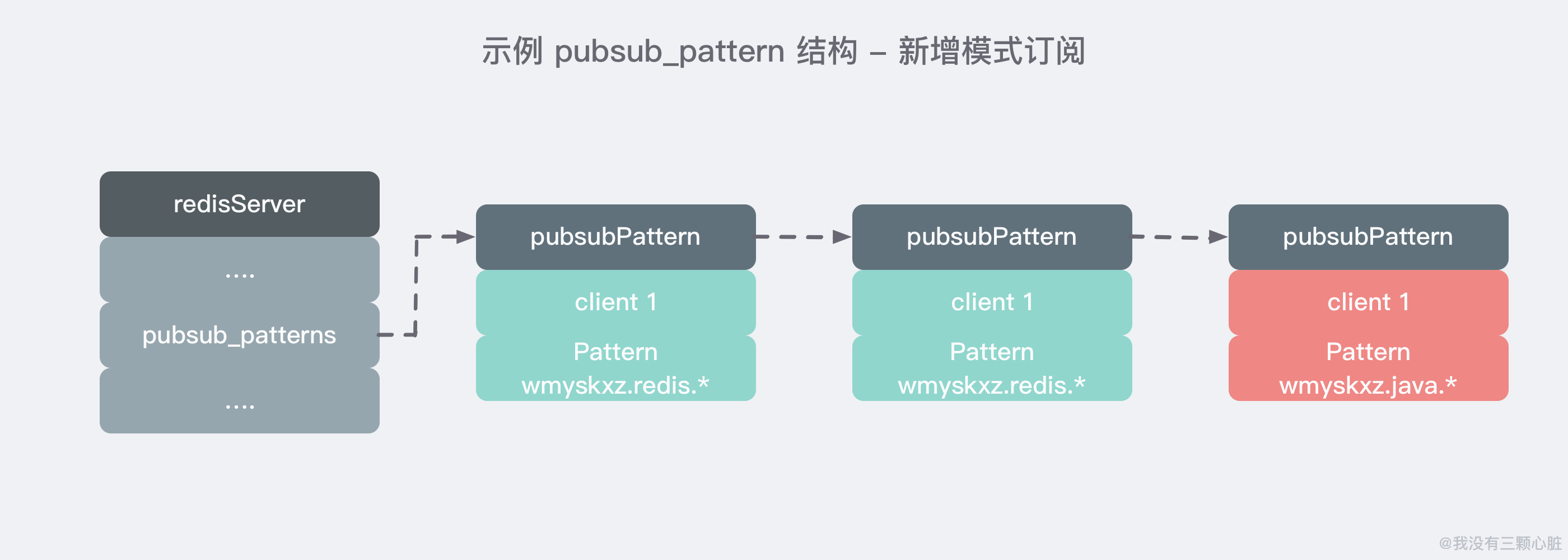 每当调用 PSUBSCRIBE 命令订阅一个模式时,程序就创建一个包含客户端信息和被订阅模式的 pubsubPattern 结构,并将该结构添加到 redisServer.pubsub_patterns 链表中。