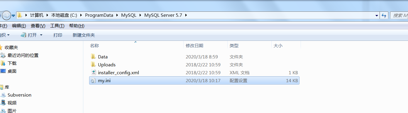 在MySQL5.7中,它的配置文件my.ini没有放到它的安装目录,而是放到了Program Data文件夹下,找到Program Data文件夹(C盘中的这个文件夹是隐藏了的),然后对my.ini文件进行修改: