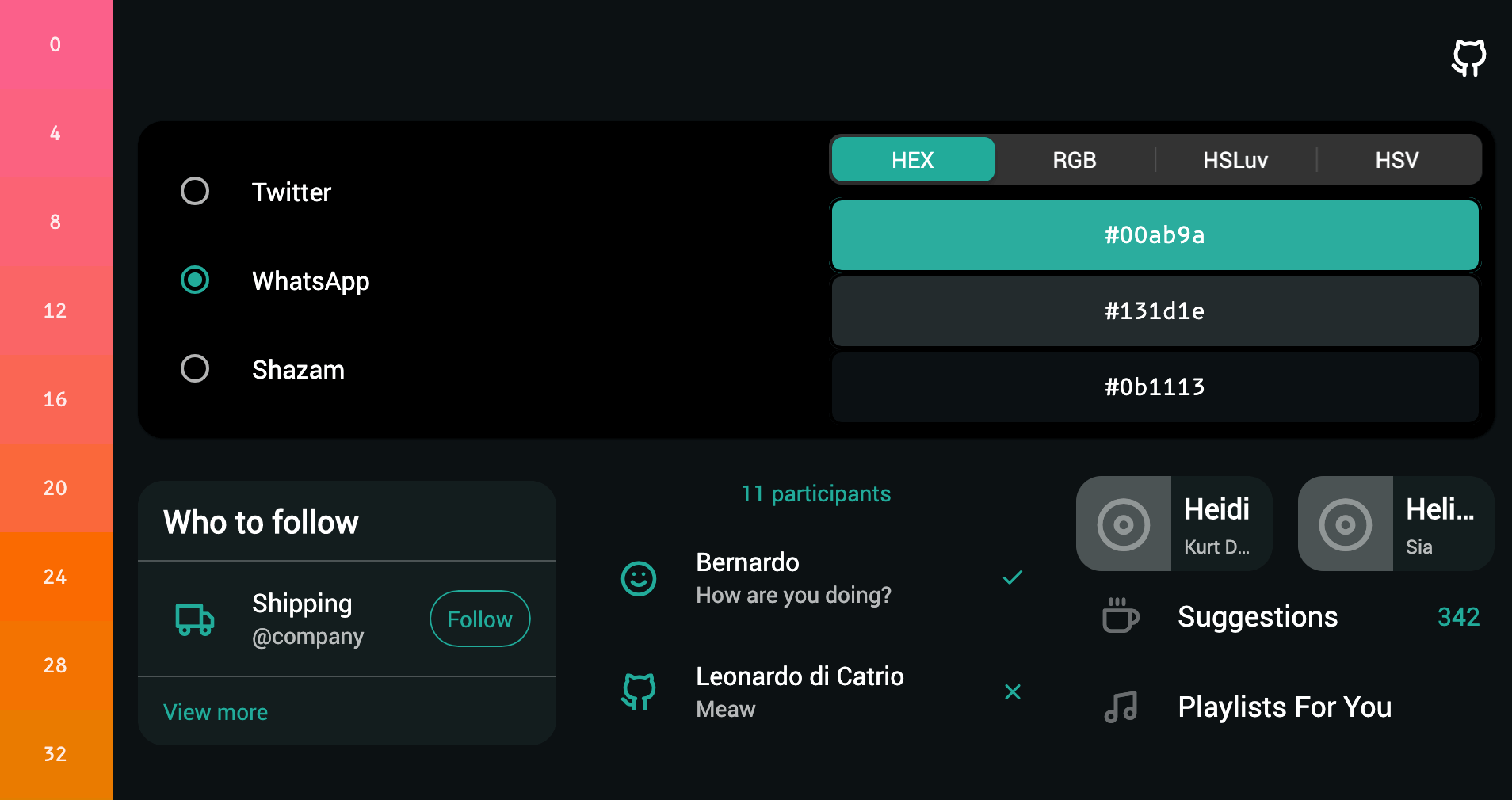 This project is a Flutter web experiment. It allows you to prototype dark mode colors based on popular apps: WhatsApp, Twitter and Shazam. You can select the Hue value you want, and the project will select everything else.