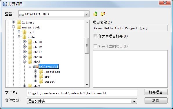 选择菜单栏中的文件,然后选择打开项目,直接定位到Hello World项目的根目录,NetBeans会十分智能地识别出Maven项目,如图3-6所示: