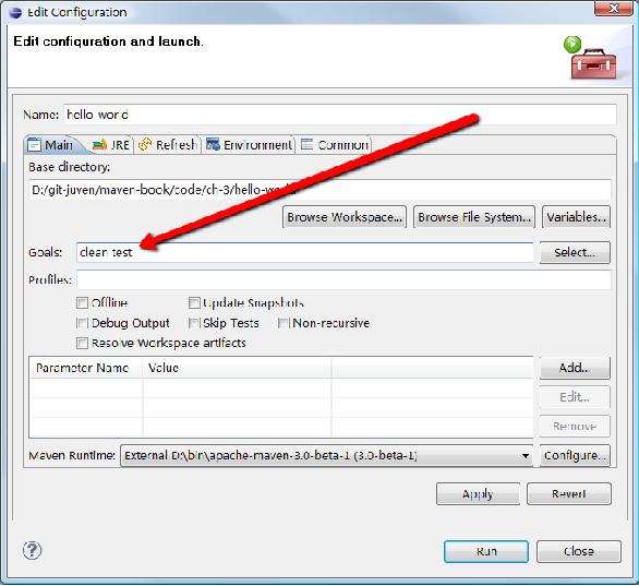 选择想要执行的Maven命令就能执行相应的构建,同时我们也能在Eclipse的console中看到构建输出。这里常见的一个问题是,默认选项中没有我们想要执行的Maven命令怎么办?比如,默认带有mvn test,但我们想执行mvn clean test,很简单,选择Maven buid… 以自定义Maven运行命令,在弹出对话框中的Goals一项中输入我们想要执行的命令,如clean test,设置一下Name,点击Run即可。并且,下一次我们选择Maven build,或者使用快捷键Alt + Shift + X, M快速执行Maven构建的时候,上次的配置直接就能在历史记录中找到。图3-5就是自定义Maven运行命令的界面: