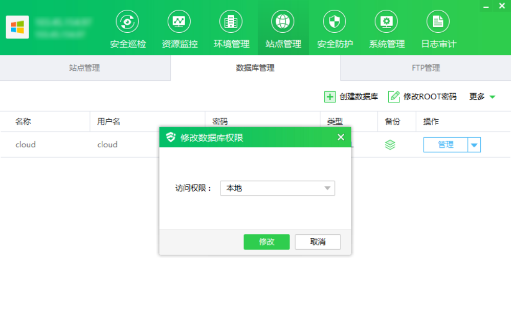① 点击“权限”,显示修改数据库权限弹框