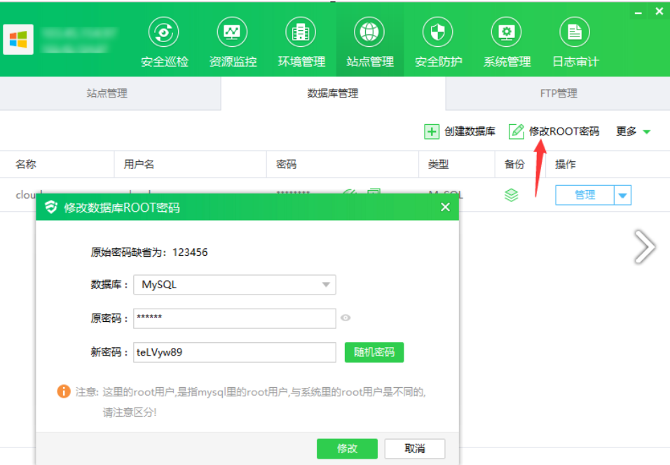1.点击"修改 ROOT 密码",显示修改数据库 ROOT 密码弹框