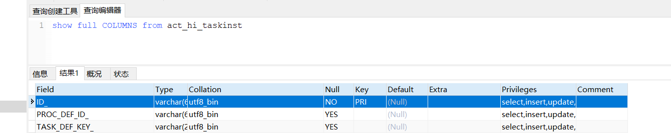 act_hi_taskinst表字段ID_的字符集为:utf8_bin。
