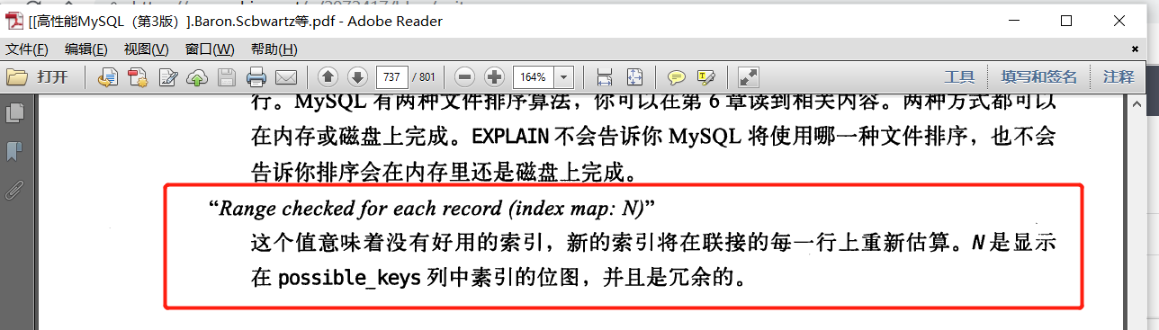 Extra列,Range checked for each record (index map: 0x2)的意思为没有合适的索引可用。以下为《高性能MySQL》一书的解释: