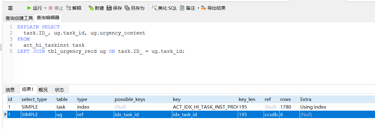 项目使用Activiti进行工单业务开发时 ,将历史任务实例表( act_hi_taskinst )和催单记录表(tbl_urgency_recd)进行left join关联开发时,发现已经建了索引,但是执行计划里显示没有使用索引。