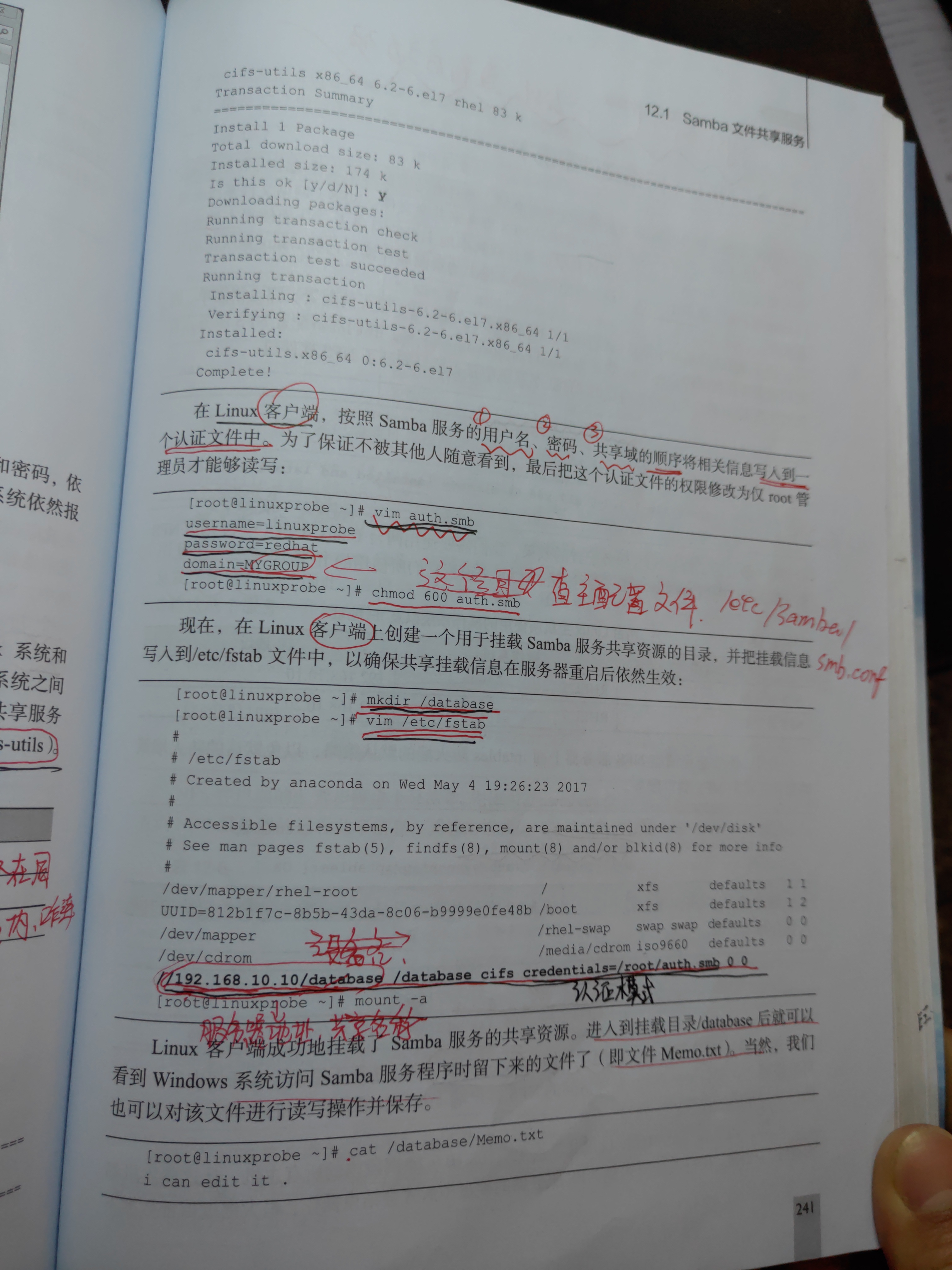在linux系统中需要安装文件共享服务的软件包cifs-utils。创建认证文件,按照Samba 服务的用户名、密码、共享域的顺序。共享域通过主配置文件的workgroup确定。