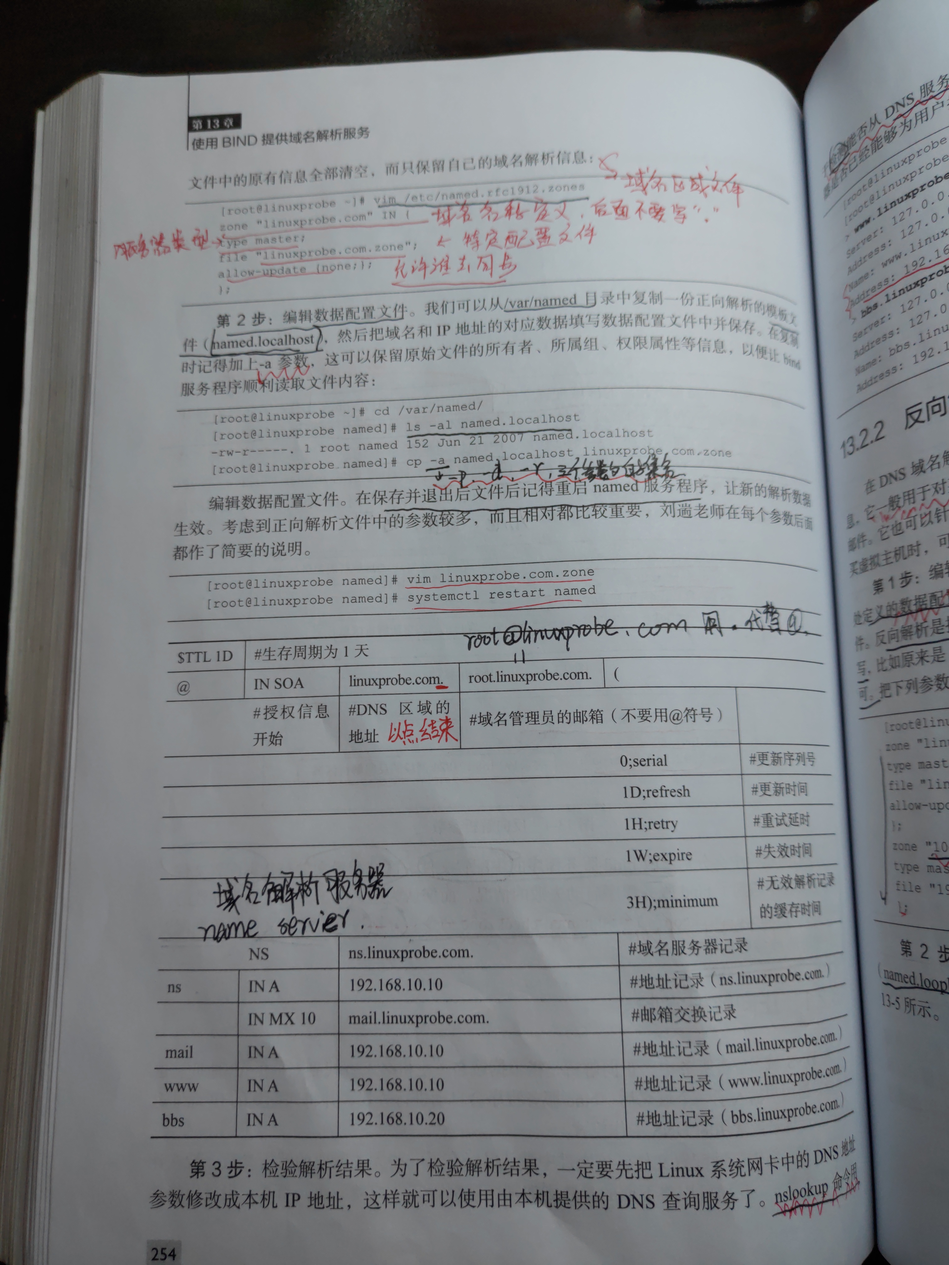 数据文件的配置是通过/var/named目录复制named.localhost的模板文件,要注意在域名后面加上点“.”,如linuxprobe.com.,这是根域。还有写邮件账号的@符号要改成“.”否则会造成冲突报错。