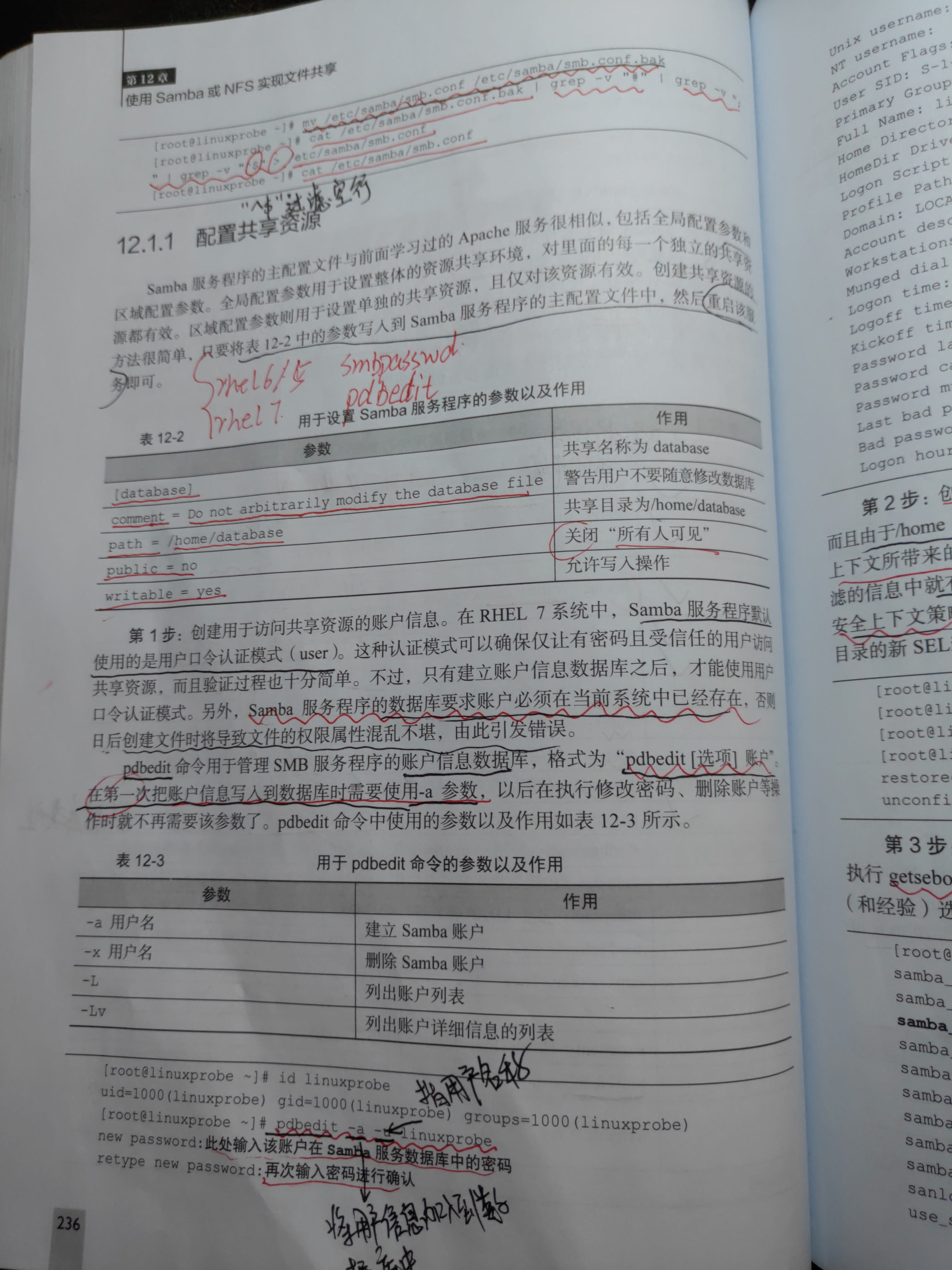 配置共享资源过程中,samba服务默认使用口令认证模式,口令认证模式要基于账户信息数据库,而且账户必须在系统中已经存在。pdbedit命令(RHEL7系统)用户管理该服务的账户数据库,在红帽RHEL5/6系统中是通过smbpasswd命令管理,-a参数表示第一次把账户信息写入到数据库中。