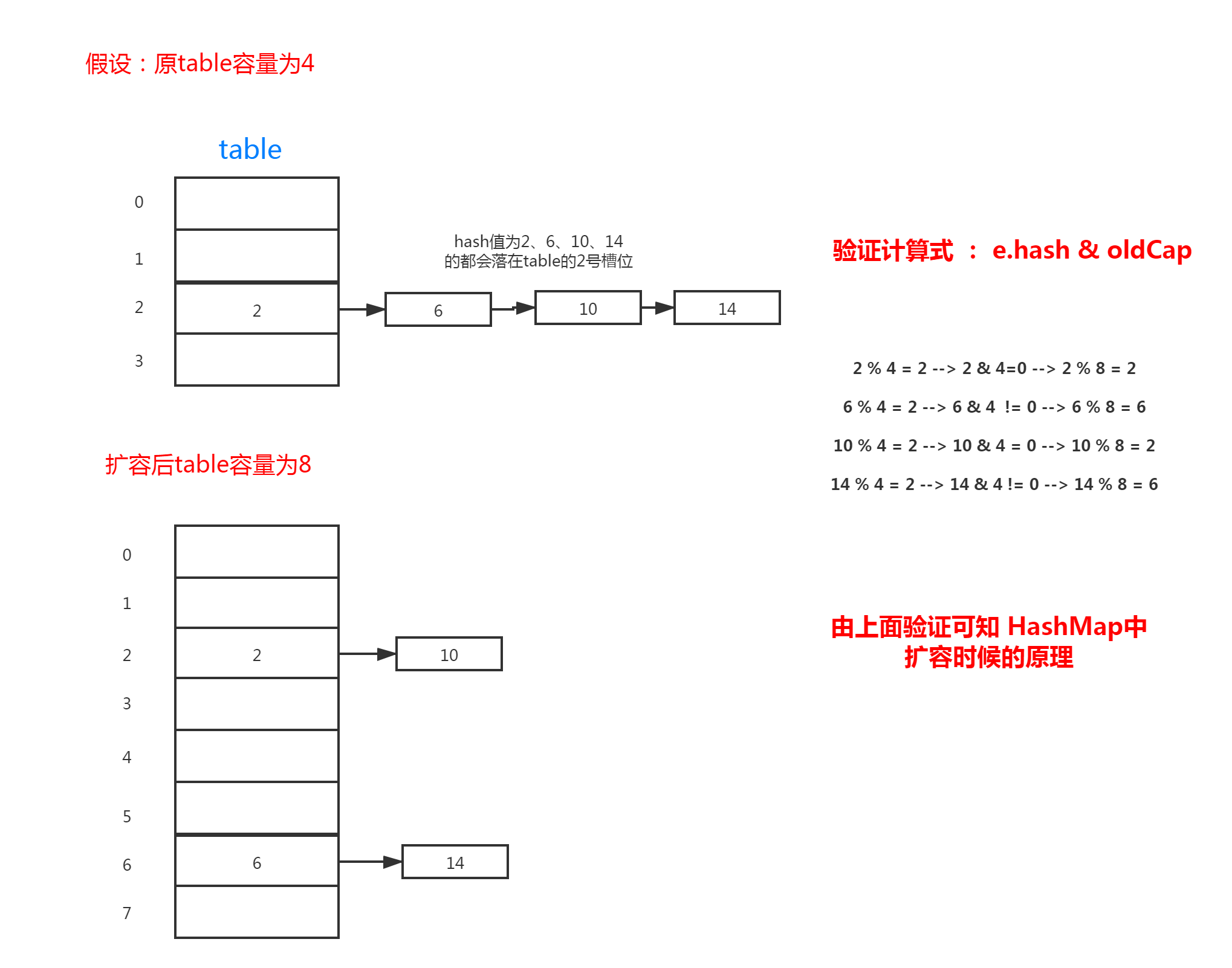 ① 我起初第一次看代码时候不理解if ((e.hash & oldCap) == 0)这个判断的意思,经过计算后就显而易见,举例如下图。