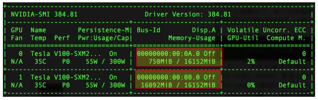 运行nvidia-smi命令,观察GPU 0和GPU 1上的显存占用情况。