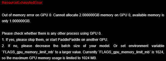 若设置了FLAGS_gpu_memory_limit_mb=1024,则会报出显存不足错误,如图2所示。表明任务使用的最大显存量被限定为1024MB。