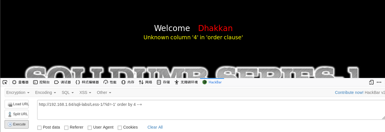 http://192.168.1.64/sqli-labs/Less-1/?id=-1' order by 4 --+
