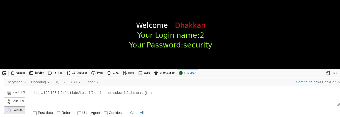 http://192.168.1.64/sqli-labs/Less-1/?id=-1' union select 1,2,database() --+