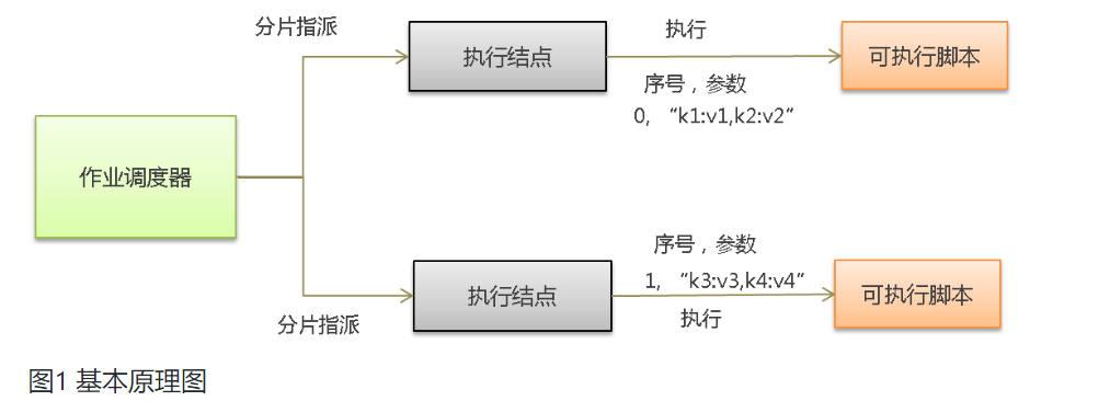 说明:Saturn的基本原理是将作业在逻辑上划分为若干作业分片,通过作业分片调度器将作业分片指给特定的执行节点,执行节点通过quertz出发执行作业的具体实现(以shell为例,则为shell脚本),在执行的时候,会将分片序号和参数传入,如下图所示,作业的实现逻辑分析分片序号和分片参数,并以此为依据来调用具体的实现(比如一个批量处理数据库的作业,可以划分0号分片处理1-10号数据库,1号分片处理11-20号数据库)。