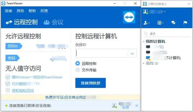Teamviewer面向个人使用是免费的,会弹出烦人的广告。但如果长期使用会被判断为商业行为,5分钟就会被断开。