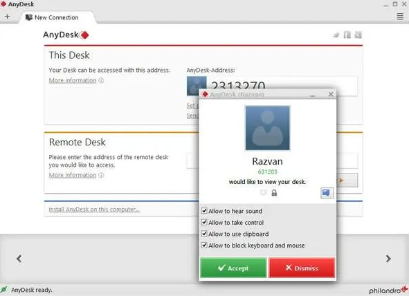 AnyDesk据说是前TeamViewer开发小组人员自立门户的商品,它拥有领先的视频压缩技能DeskRT,能够轻松穿透防火墙/路由器。同时,AnyDesk支持加密,支持剪贴板同步。官方自带简体中文,但不完整,有些地方还是显示英文,而且翻译不太准确。除了远程桌面功能较好,其他远程功能较薄弱。