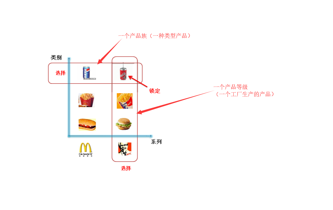 从上图中我们看到面包、薯条、可乐3种零食。相同零食代表一个产品族。麦当劳、I mlovein it卖的面包、薯条、可乐代表产品等级结构。