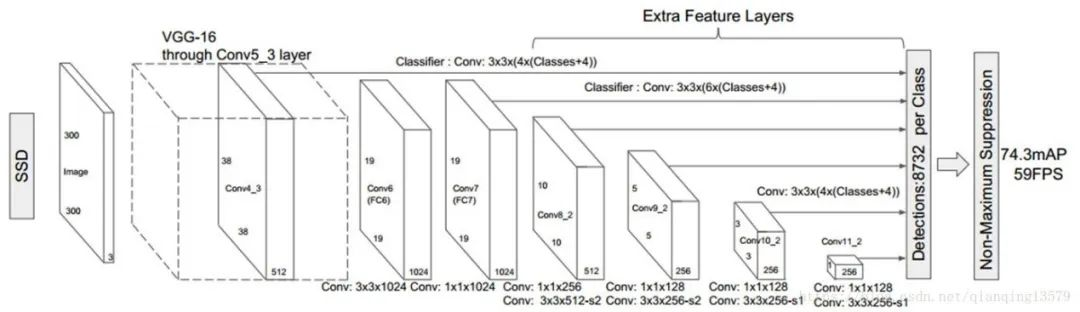其中,通信模块负责连接眼镜上的摄像头进行传输,将视频数据传给手机端,而交互模块则完成实时播报和语音交互。而最核心的则为分析模块,包含SSD深度神经网络,用于完成物体检测与识别,其基本网络结构如图所示: