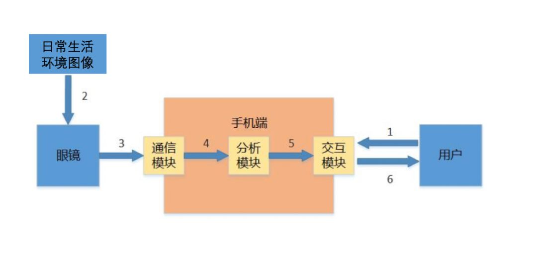 整个系统由三个交互的主题构成:眼镜、手机以及用户,而在具体实现过程中,我们将系统分为如下几个部分:
