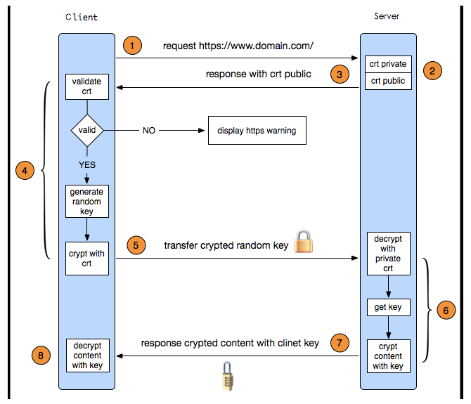 4.客户端收到服务器端的公钥之后,会对公钥进行检查,验证其合法性,如果发现发现公钥有问题,那么HTTPS传输就无法继续。严格的说,这里应该是验证服务器发送的数字证书的合法性,关于客户端如何验证数字证书的合法性,下文会进行说明。如果公钥合格,那么客户端会生成一个随机值,这个随机值就是用于进行对称加密的密钥,我们将该密钥称之为client key,即客户端密钥,这样在概念上和服务器端的密钥容易进行区分。然后用服务器的公钥对客户端密钥进行非对称加密,这样客户端密钥就变成密文了,至此,HTTPS中的第一次HTTP请求结束。