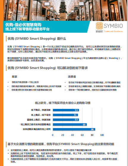优购 (SYMBIO Smart Shopping) 是一个从线上到线下的全方位商购服务平台。 既可以让消费者享受在家购物的便捷,同时也得到线下消费的透明和高效。从帮助商家促销的角度来说,通过线上易于宣传的特点,帮助商家引流线上消费者到线下消费,也可以是反向的,通过线下的服务让消费者自愿到线上注册会员并且消费。