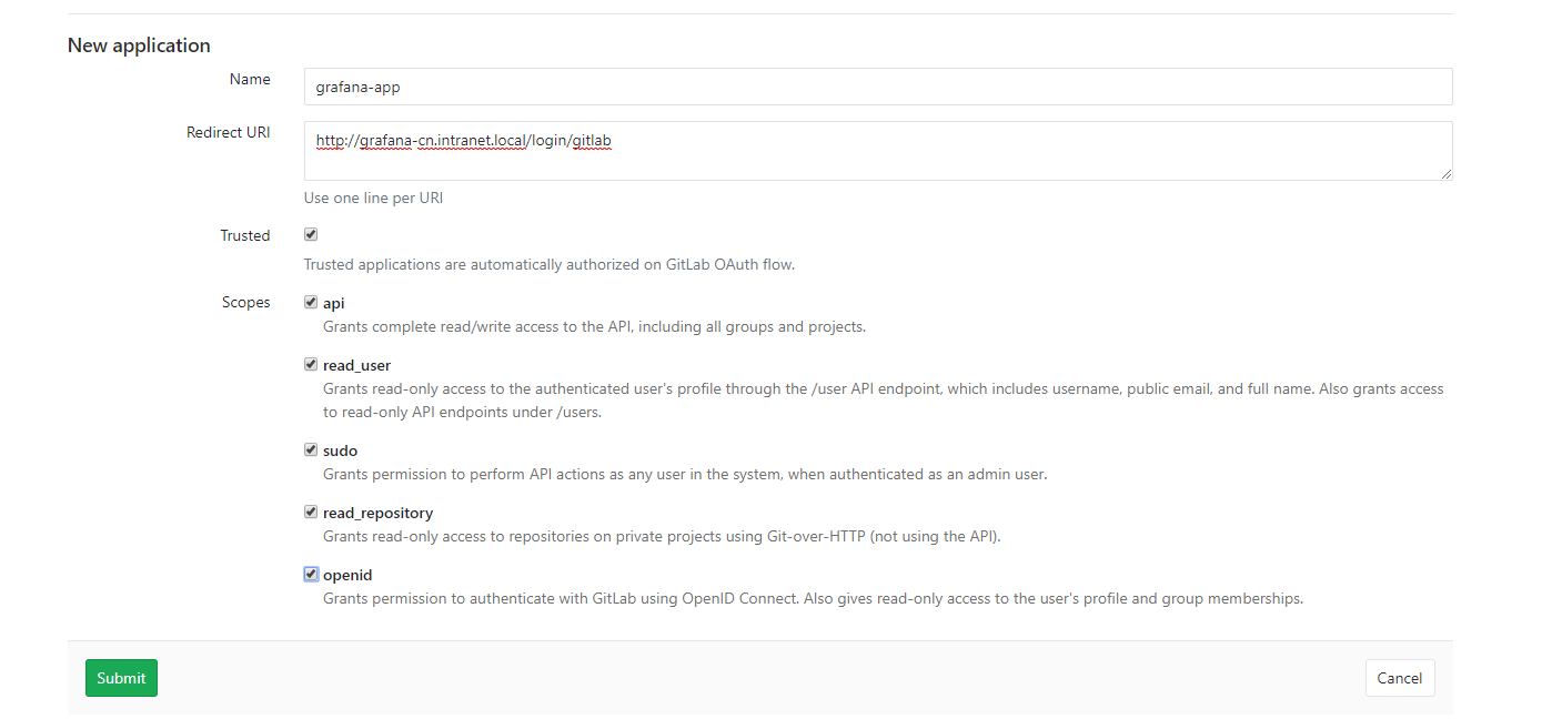 - Redirect URI http://grafana-cn.intranet.local/login/gitlab