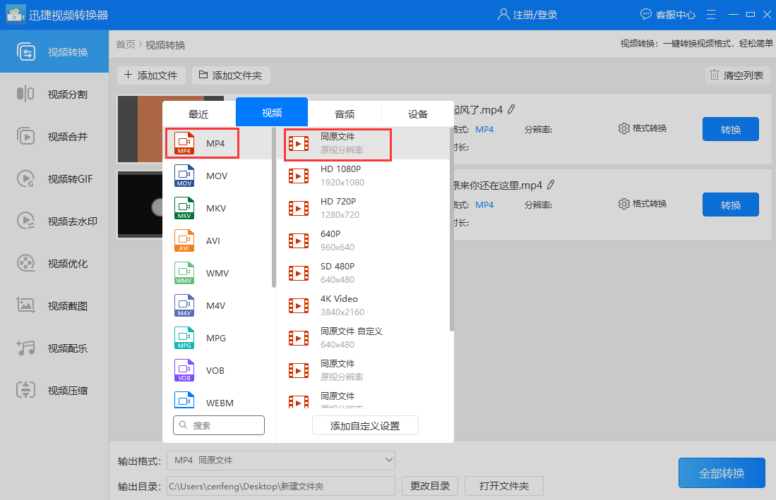 由于要将kux转mp4,因此在添加好文件后首先把输出格式中输出的视频格式修改为想要的‘mp4’格式,与此同时还可以把输出分辨率调整为同原文件或别的想要的分辨率。