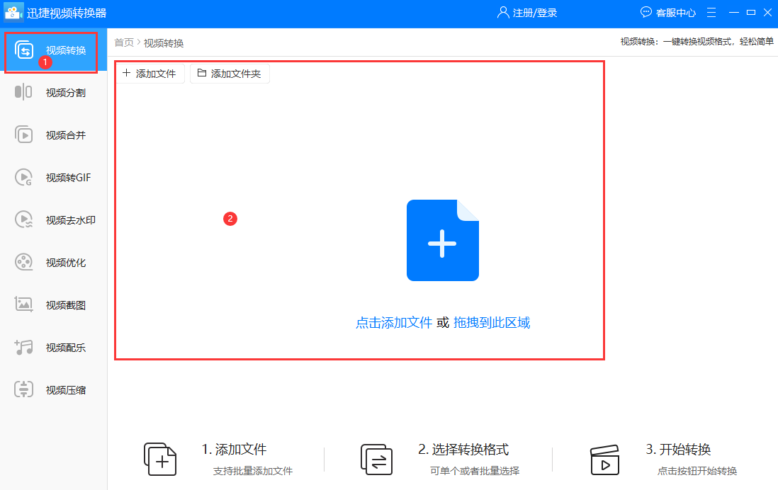 随后我们会到达视频编辑界面,根据kux转mp4的需求选择对应的视频转换功能。接着把准备好的kux文件添加到该转换界面(添加的方式分为拖拽和按钮添加两种,任选一种方式即可添加文件)。