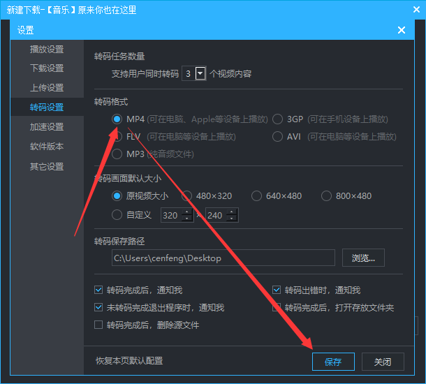 而后点击其右侧的‘设置’选项,之后会出现文件转码的属性框,需要将转码方式调整为即将要转换的‘mp4’格式。接着就可以开始下载mp4格式的视频了。
