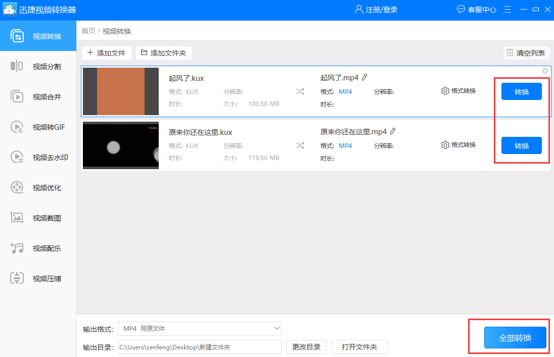 转换参数都调整完毕后点击全部转换按钮就可以把添加好的多个kux文件统一转换成mp4格式。当然了,也可以点击转换按钮依次转换kux文件。