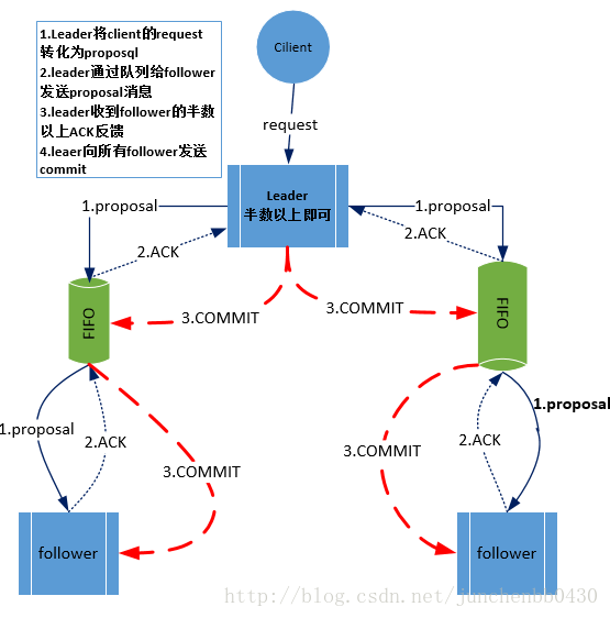 3. leader服务器与每个follower之间都有一个队列,leader将消息发送到该队列 。