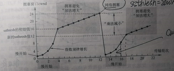 - 当cwnd>ssthresh时,使用拥塞避免算法。即将cwnd的递增速率改为每次增加1,当出现超时时,就把慢开始门限ssthresh设置为之前的一半,并把cwnd置1且重新执行慢开始算法。