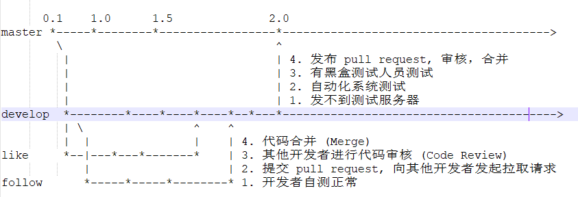- master: 主干分支,代码经过严格测试,最稳定,可以随时上线
