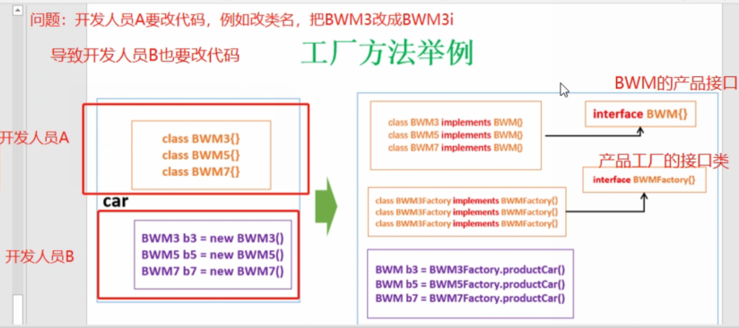 * 通过工厂把new对象隔离,通过产品的接口可以接受不同实际产品的实现类,实例的类名的改变不影响其他合作开发人员的编程