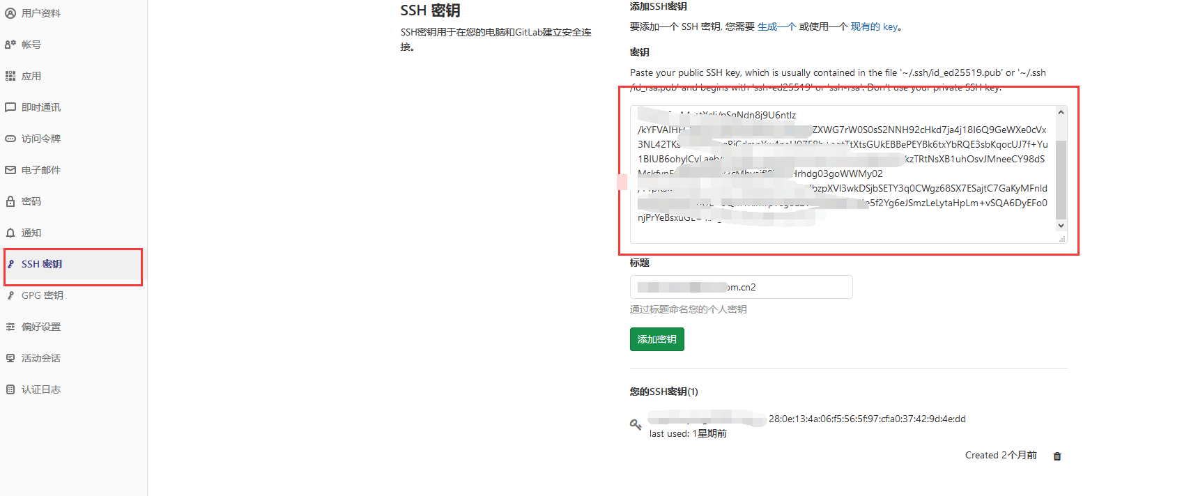 登陆Gitlab,打开用户设置,“SSH 密钥”页面: