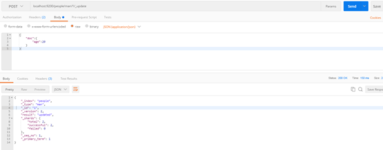 - 方式一:直接修改文档,打开Postmain,选择POST 方法,输入localhost:9200/people/man/1/_update,运行结果如下: