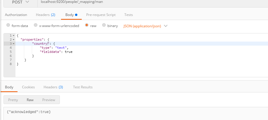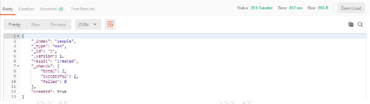 - 方式一:指定文档ID 插入,在Postman 中使用PUT 方法,输入localhost:9200/people/man/1,在raw 区域输入: