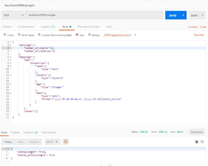 { "settings":{ "number_of_shards":3, "number_of_replicas":1 }, "mappings":{ "man":{ "properties":{ "name":{ "type":"text" }, "conutry":{ "type":"keyword" }, "age":{ "type":"integer" }, "date":{ "type":"date", "format":"yyyy-MM-dd HH:mm:ss ||yyyy-MM-dd||epoch_millis" } } }, "woman":{} } }
