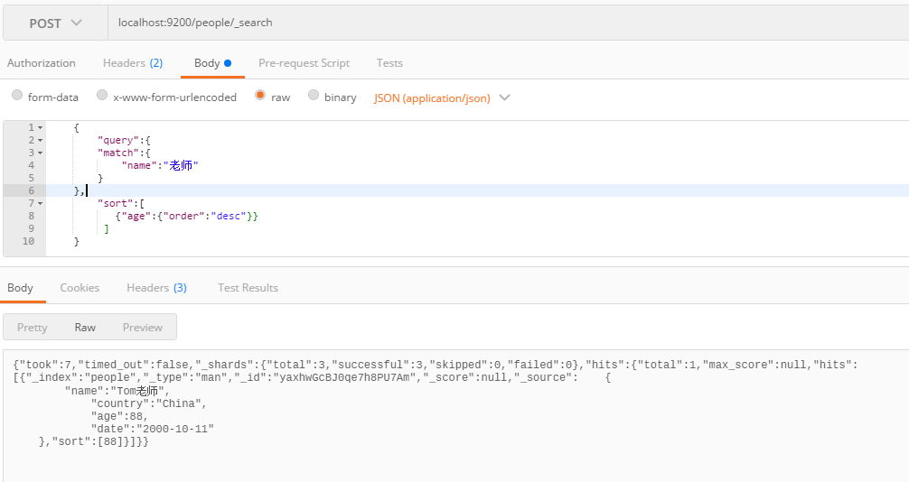 { "query":{ "match":{ "name":"老师" } }, "sort":[ {"age":{"order":"desc"}} ] }