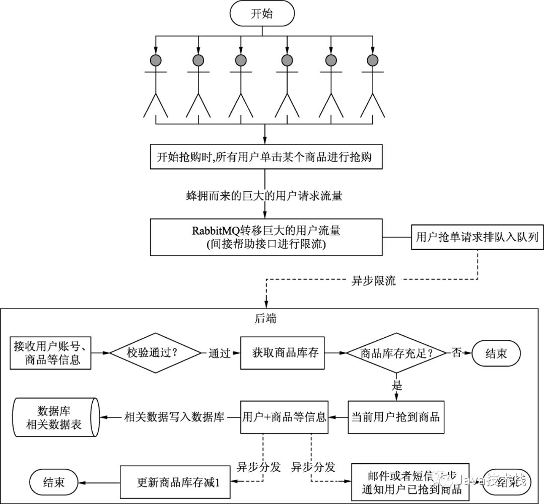 2)消息异步分发:当商品库存充足时,当前抢购的用户将可以抢到该商品,之后会异步地通过发送短信、发送邮件等方式通知用户抢购成功,并告知用户尽快付款,即在某种程度上实现了“消息异步分发”。