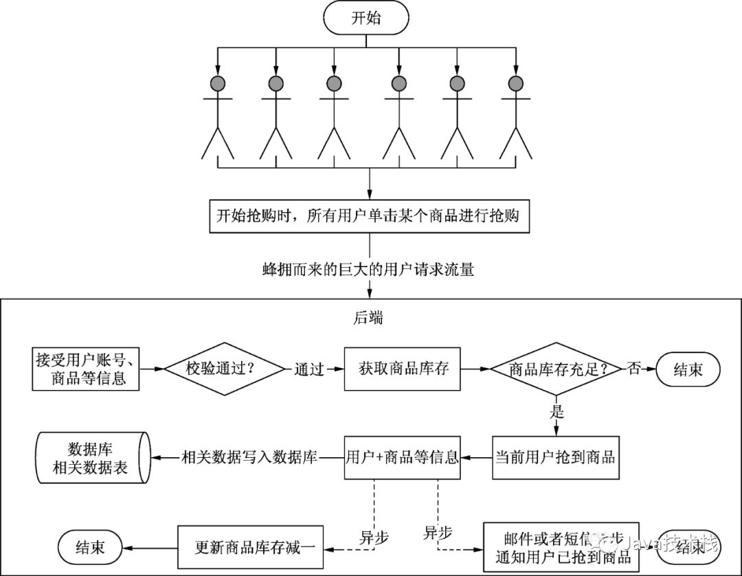 毫无疑问,在抢购活动开始的那一刻,将会产生巨大的用户抢购流量,这些请求几乎在同一时间到达后端系统接口。而在正常的情况下,后端系统接口在接收到前端发送过来的请求时,会执行如下流程: