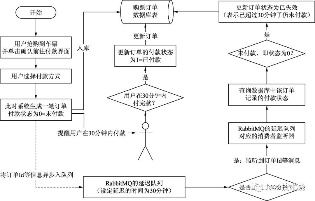 而消息中间件RabbitMQ的引入,不管是从业务层面还是应用的性能层面,都大大得到了改善,如图7为引入RabbitMQ消息中间件后“抢票成功后30分钟内未付款的处理流程”的优化。