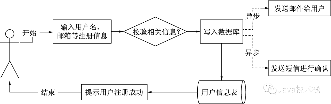 从图2的流程可以看出,用户从单击“注册”按钮,提交相关信息之后便需要经历“漫长”的等待时间,整体的等待时间约等于“写入数据库”+“邮箱验证”+“短信确认”的处理时间之和。在处理过程中如果发邮件和发短信业务逻辑出现异常,整个流程将会终止,很显然这种处理方式对于当前互联网用户来说几乎不能接受!